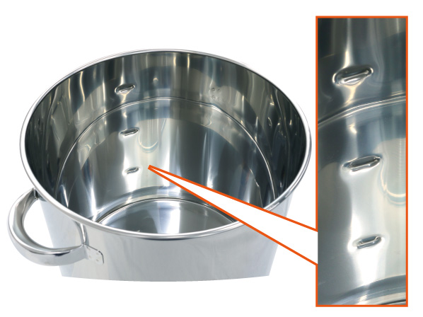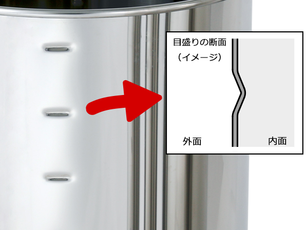 確認できます。タンクの外側から内側に向けて目盛りを打ち込み、内側へ凹ませています。
