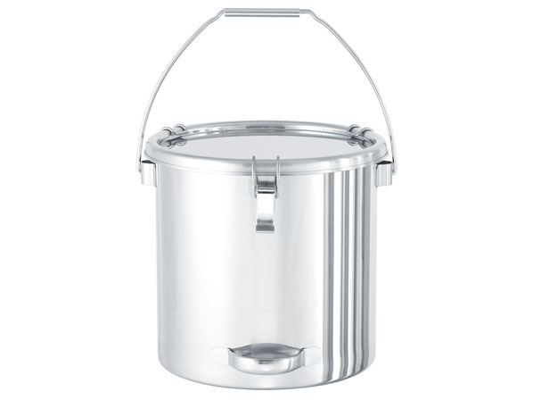 ○ツル(吊り下げ用の取っ手)の付いた丸型ステンレス容器です。