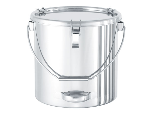 水や原料等を流しやすいよう、下部に取っ手を付けたステンレス容器