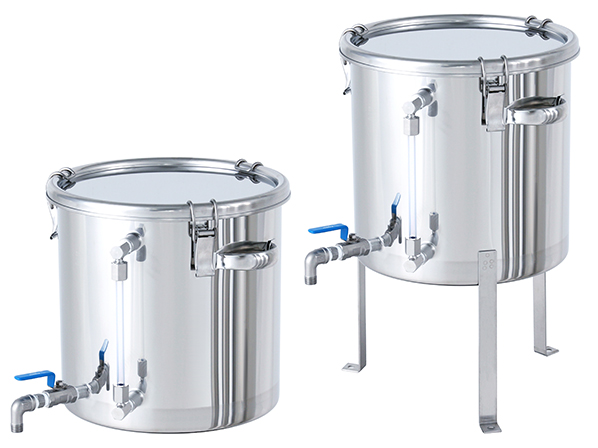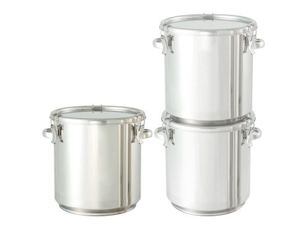 新規事業として、手作り方式でビールを生産するお客様のオーダーメイド事例です。 - シール貼り付け座板付容器【採用事例】工程や内容物のシール表示ができるステンレス容器