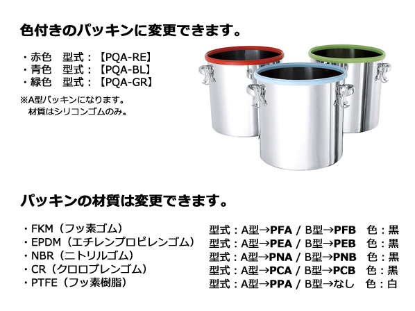 | 型式 | 容量 | 重量 | 内径 | 内高 | クリップ | 板厚 | パッキン | パッキン | 納期 |