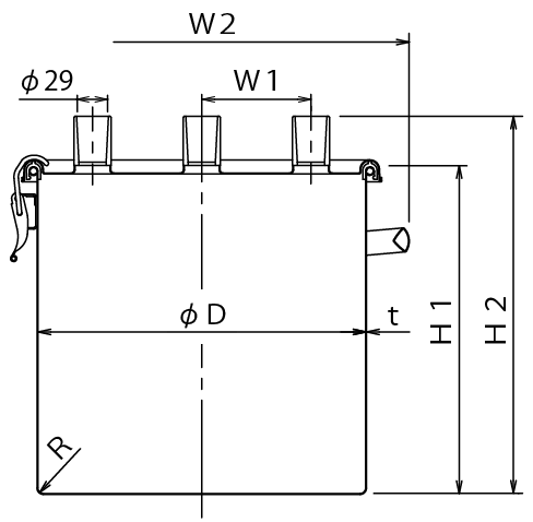 | 型式 | 容量 | 重量 | 内径 | 内高 | 全高 | 間隔 | 最大幅 | 板厚 | 底 | 納期 |
