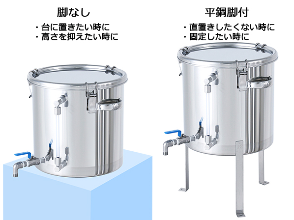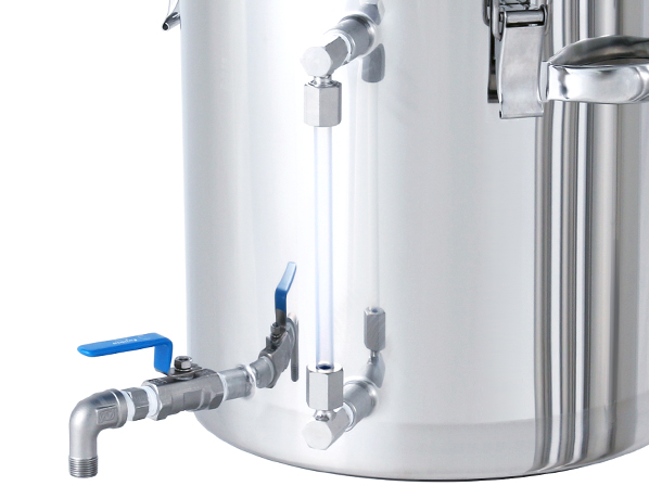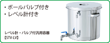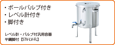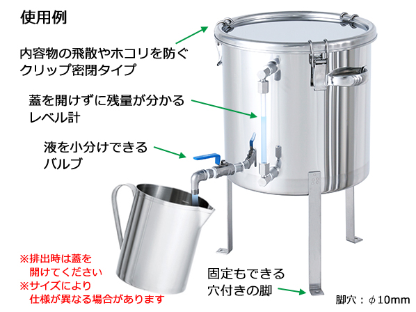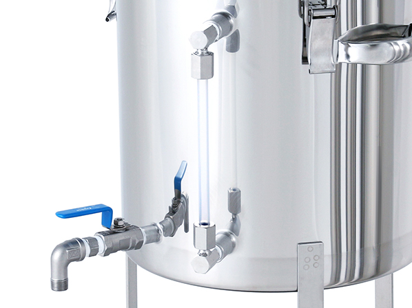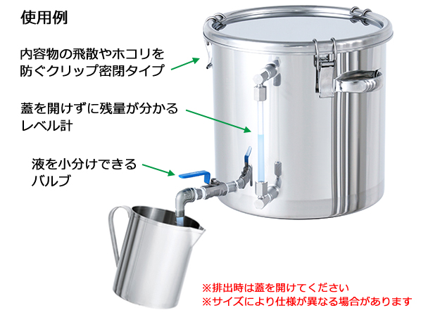 残量が一目で分かるレベル計を取り付けました。小分けをするのに便利なボールバルブ付きの丸型ステンレス容器です。