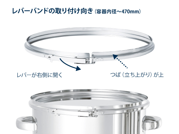 〇レバーバンドとパッキンで蓋を固定して密閉する丸型ステンレス容器。