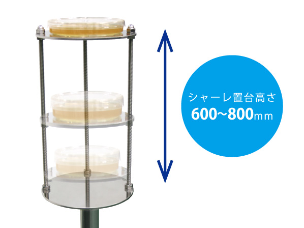 ※厚労省通知 「弁当及びそうざいの衛生規範について」に基づく○シャーレ置台は600~800mmの範囲で高さ変更が可能です。