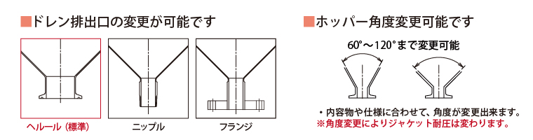 標準ではヘルール接続となっていますが、使用環境・内容物・接続先などに合わせて、排出口の「種類」や「サイズ」を変更できます。ニップル・ソケット・フランジの他、お客様ご指定の継手や規格での製作も承っています。また、ホッパー角度も変更可能です。