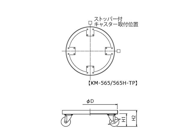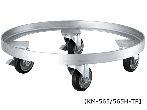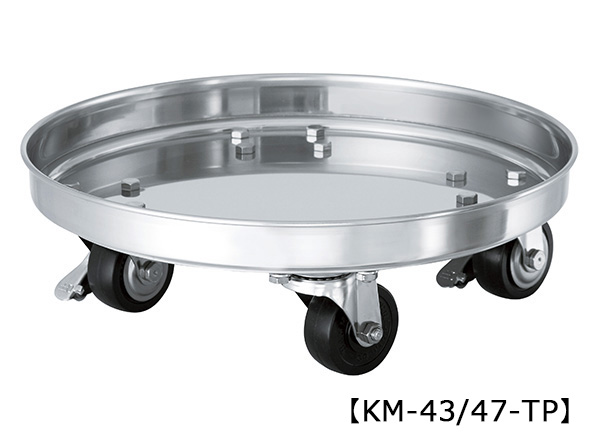 【KM-TP】はテーパー型容器専用台車です。【KM】はストレート容器(テーパーでないもの)専用台車です。