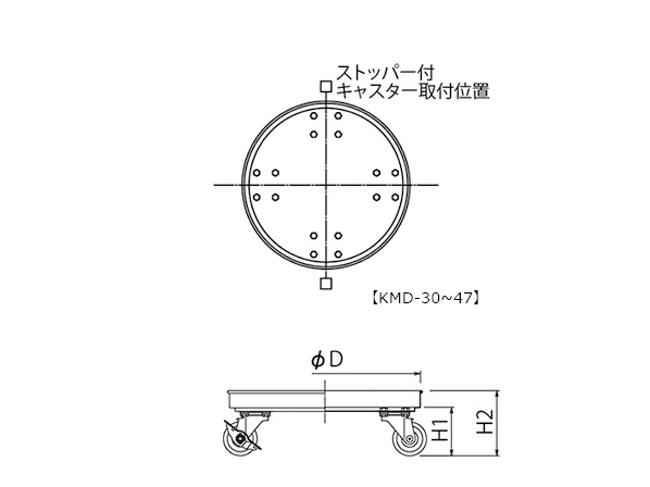 テーパー型容器専用台車【KM-TP】をご使用ください。