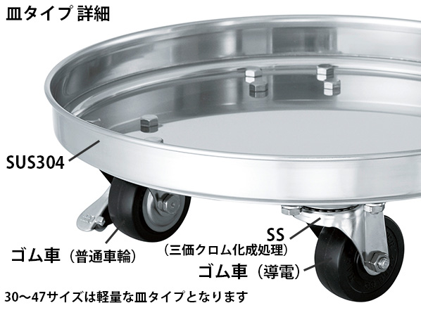 | 型式n | 適用容器 | 重量 | 内径 | 高さ | 全高 | 車輪径 | 耐荷重 | 納期 | RoHS |