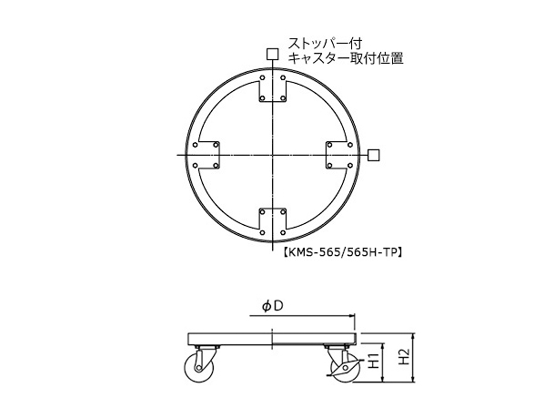 【KM-TP】はテーパー型容器専用台車です。【KM】はストレート容器(テーパーでないもの)専用台車です。