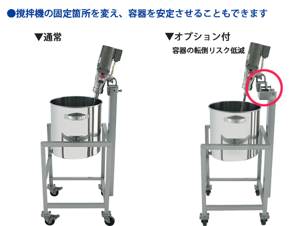 通常の位置に撹拌機を設置すると重心は容器の外側になるため、特に重い撹拌機を設置した場合には、容器が転倒する可能性があります。それを防ぐために、撹拌機を固定する位置を前に出すことで重心を中央寄りにし、容器を安定させることもできます。