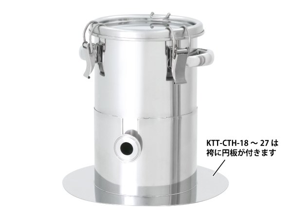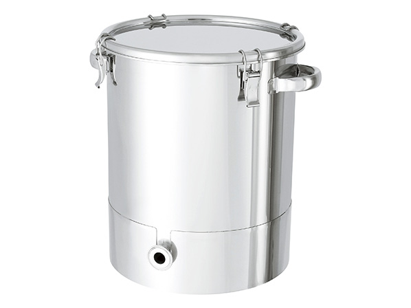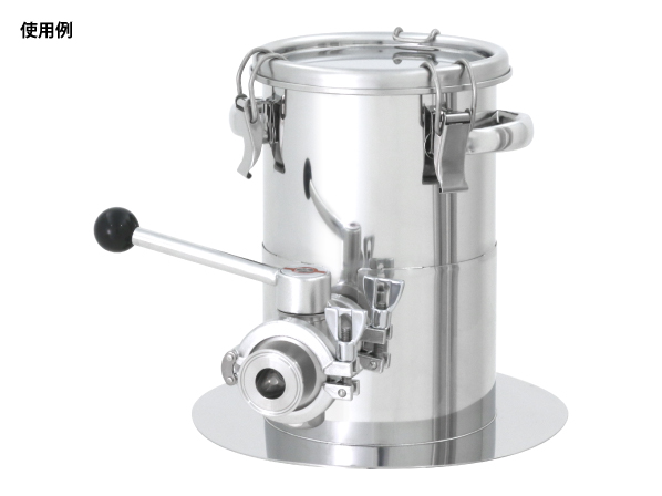 ○粘度のある液体の貯蔵・排出で使用する、片テーパー型ステンレス容器(KTT-CTL-43)のオーダーメイド事例です。