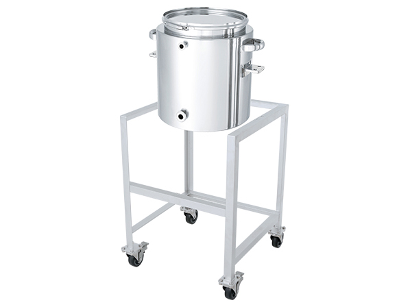 ・開閉蓋より原料を投入し撹拌後、移動先にて下部の排出口を製造機器に配管し内容液を排出します。