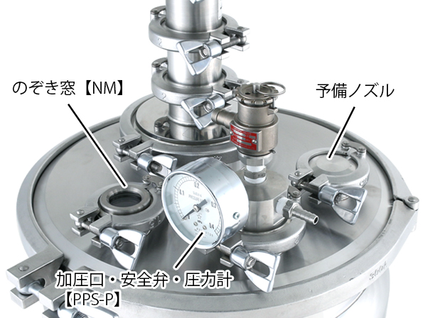 ●付属品:加圧口・安全弁・圧力計【PPS-P】/のぞき窓【NM】/手動二方ボールバルブ【BV】/撹拌機
