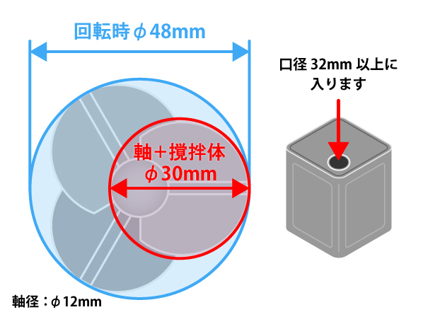 ○軸径φ10mmもしくはφ12mm対応のハンドミキサー、ドリル等に取り付けできます。