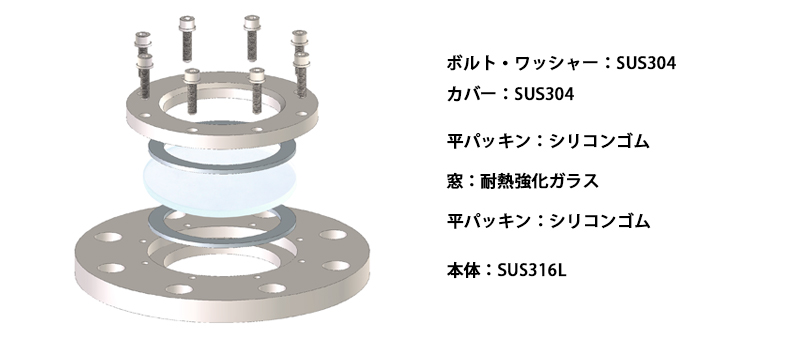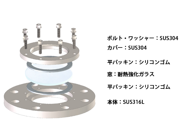 接液部にはSUS316Lを使用しており、耐食性に優れています。また、窓枠とガラスとが固定されてはいるものの、ボルトを外してすべて分解することで、洗浄・滅菌できます。