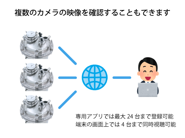 ○一つの端末(一つのアプリ)に複数のカメラを登録でき、複数の容器の遠隔管理がおこなえます。