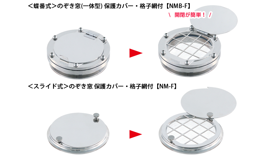 本製品は標準タイプである【NM-F】のぞき窓 保護カバー・格子網付に比べ、作業性が悪い中でも取り扱いやすい製品です。作業性について、以下のメリットがあります。