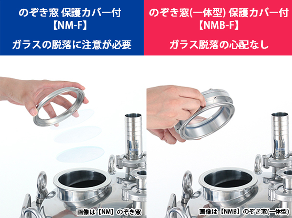 通常の【NM】のぞき窓は窓枠とガラスとが固定されていないのに対し、一体型の本製品は窓枠とガラスが固定されています。そのため、ガラス脱落による作業者のケガ、そして容器内部への破片混入の心配がありません。