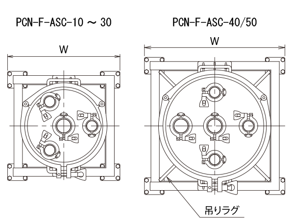 ○40L、50Lの容器は吊り上げ用に金具(穴)を取り付けています。