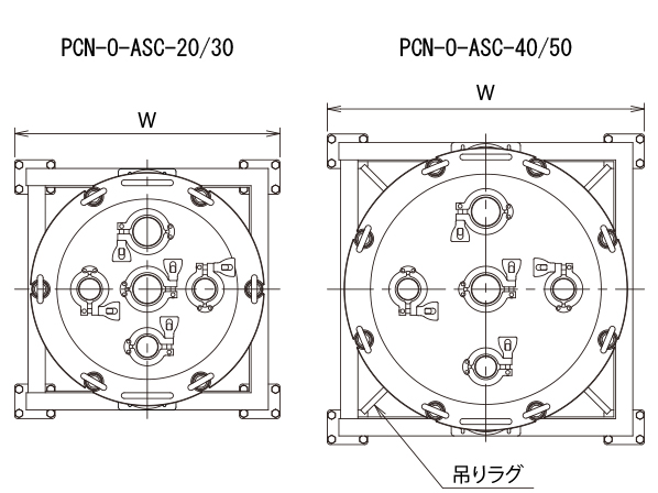 ○40L、50Lの容器は吊り上げ用に金具(穴)を取り付けています。