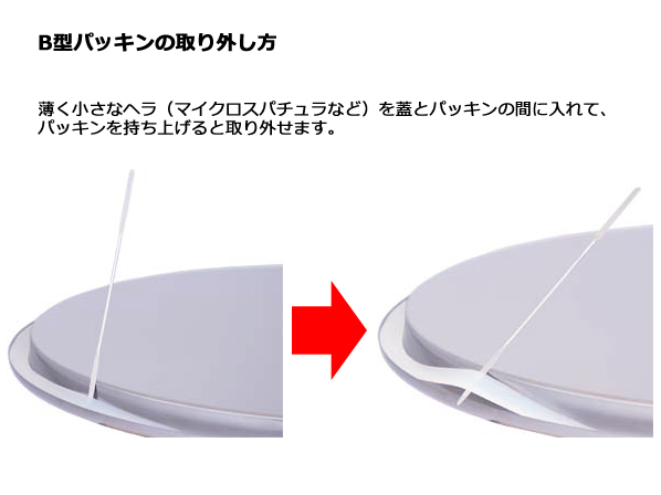 薄く小さなヘラ(マイクロスパチュラなど)を蓋とパッキンの間に入れて、パッキンを持ち上げると取り外せます。