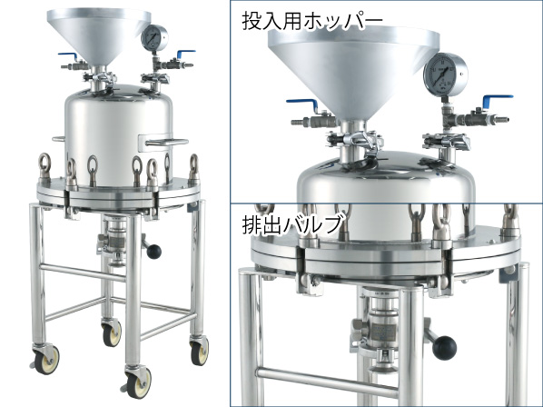 ろ過する溶液を投入するためのホッパーや、排出バルブなどもまとめてご購入いただけます。※オプション
