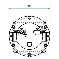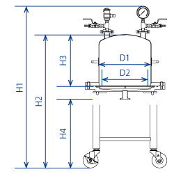 | 型式 | 容量 | 使用圧力 | 質量 | 幅 | 全高 | 高さ | 内高 | ドレン高 | 容器径 | ろ過範囲 | ろ過面積 | ドレン |