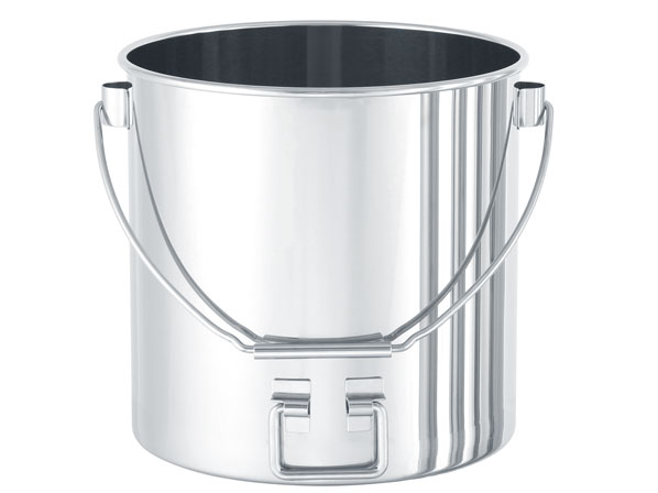 水や原料等を流しやすいよう、下部に取っ手を付けたステンレス容器