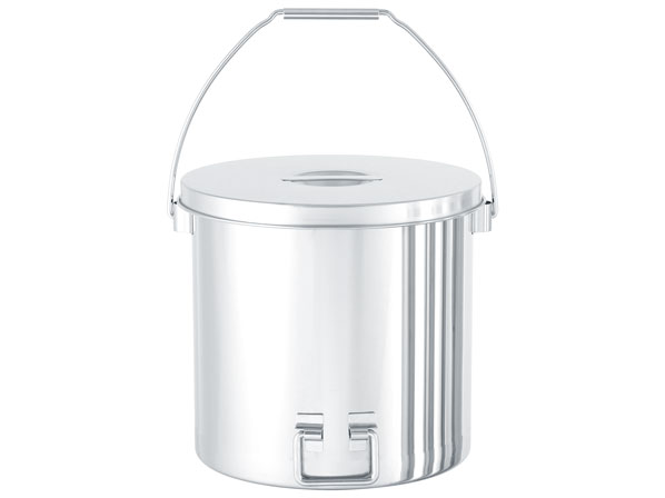 ○ツル(吊り下げ用の取っ手)の付いた丸型ステンレス容器です。