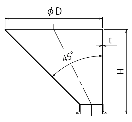 内容物や配管に合わせて、ホッパー角度の変更や寸法の変更、排出口の「サイズ」や「種類」を変更でき、オリジナルサイズでの製作が可能です。排出口の種類はヘルールの他にも、ニップルやソケットなどのねじ込み継手、フランジ継手など、お客様ご指定の規格・継手での製作も承っております。