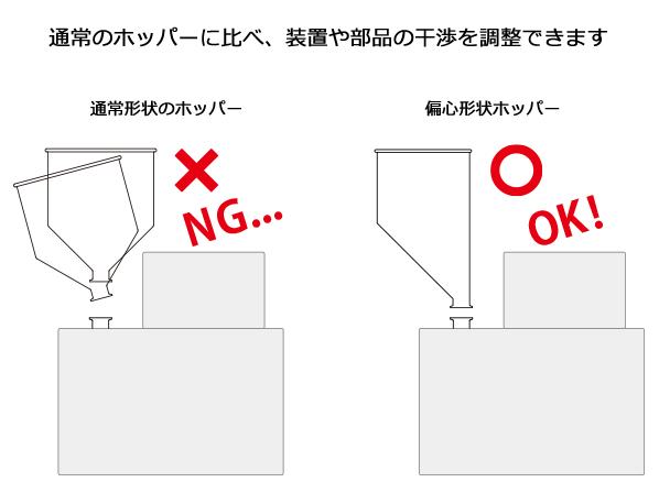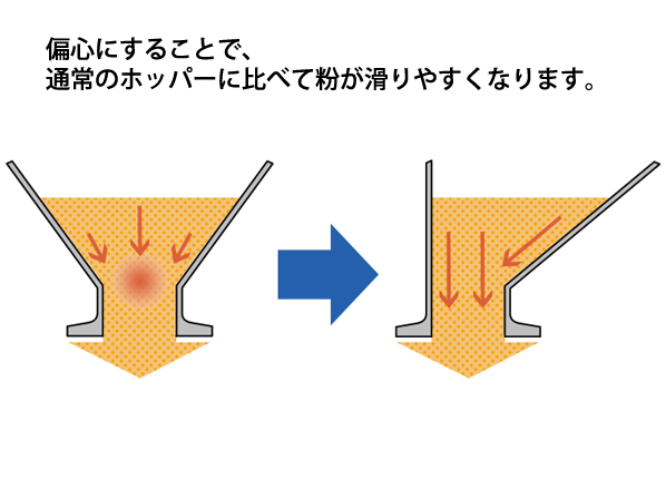 通常のホッパーとは異なる偏心形状のホッパーです。液体や粉体をスムーズに供給します。