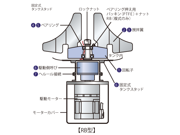 ・タンクと撹拌軸のシール部は貫通軸がなく、複雑なシール構造もないシンプルな構造です。