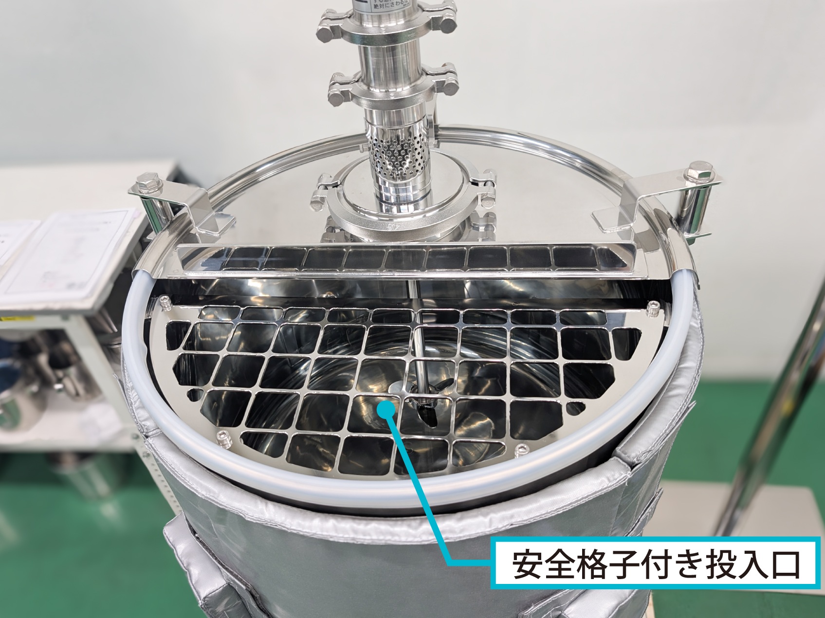 投入口には格子板(ボルト固定)を設置し、撹拌機への接触や巻き込みを防止します。