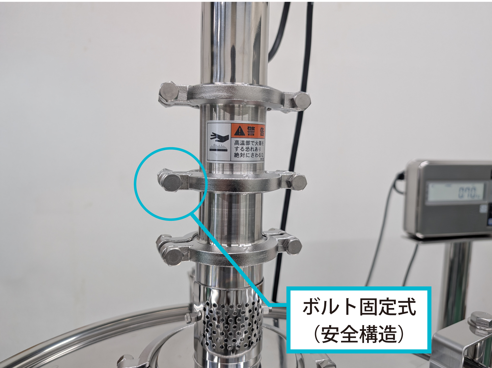 撹拌機や上蓋を固定する金具はすべてボルト式で、不用意に外れない安全構造です。