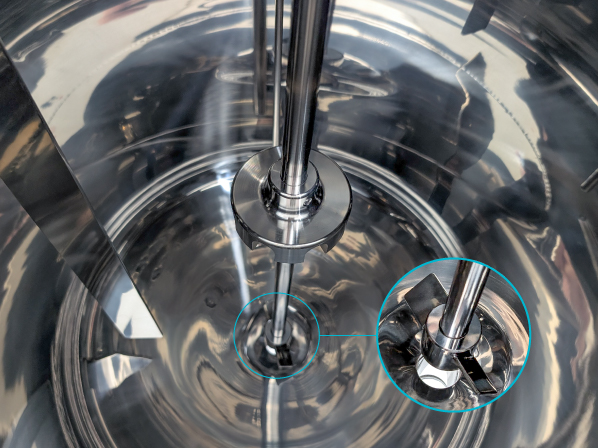 タンク底を鏡底形状にすることで、内容物の流れが滞留しにくく、撹拌循環をつくりやすい構造です。