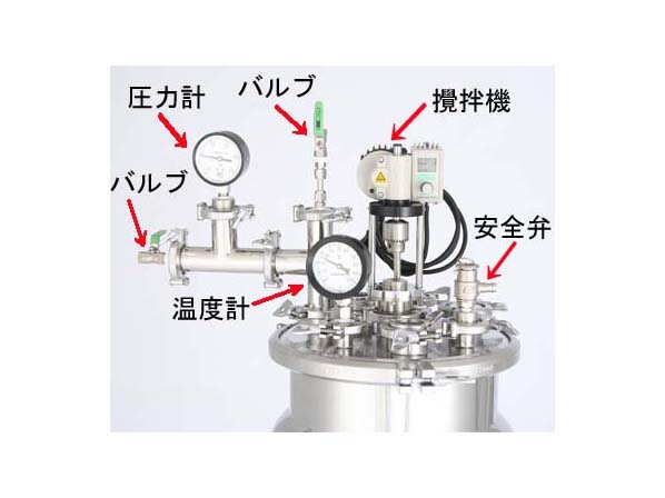 部品 可変式攪拌機(100V、45W)、安全弁、ボールバルブ、連成計、直結型温度計、バブリング、バッフル板、のぞき窓、流入管