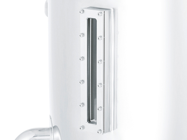 ・フィルターの状態が確認できるよう、容器側面に角フランジのぞき窓(サイトグラス)を取り付けています。