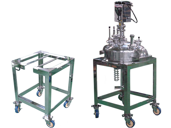 ・蓋にはブラケットを取り付けており、撹拌機や冷却コイルを取り付けたままリフターで持ち上げて移動することができ、専用架台に設置することもできます。