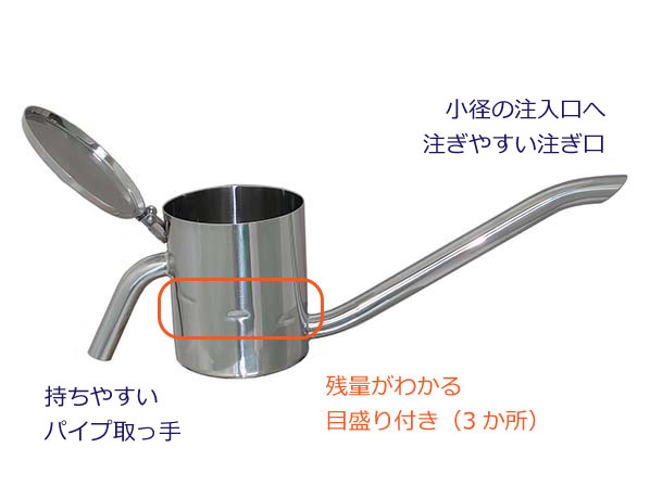 ○小分けした液体原料を小径の注入口へ注ぐ際に使用する、ステンレス製ジョウロのオーダーメイド事例です。