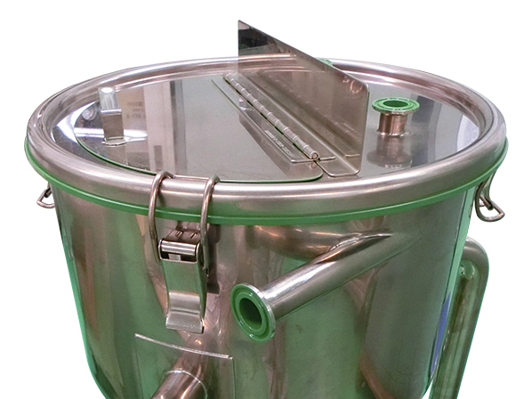 こちらのオーダーメイド事例のベースとなる製品として、「ホッパー型密閉容器 脚付 クリップ式」があります。
