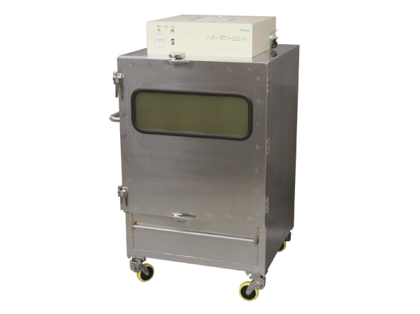 - このHEPAユニットはバッテリー搭載式で、クリーンエアで陽圧保護(グレードA環境を保持)したまま移動できるメリットがあり、無菌環境で充てんした製品(バイアル)を無菌的に搬送する際に使用します。