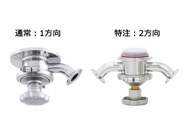 ・通常は排出口が1方向にしかありませんが、客先にて2方向への排出用途が有るため、このバルブでは2方向に排出できるようにしています。