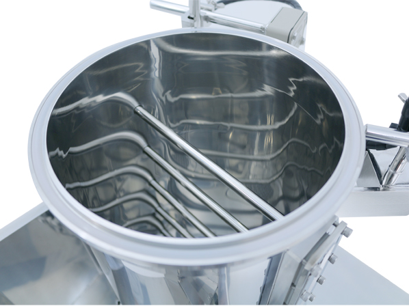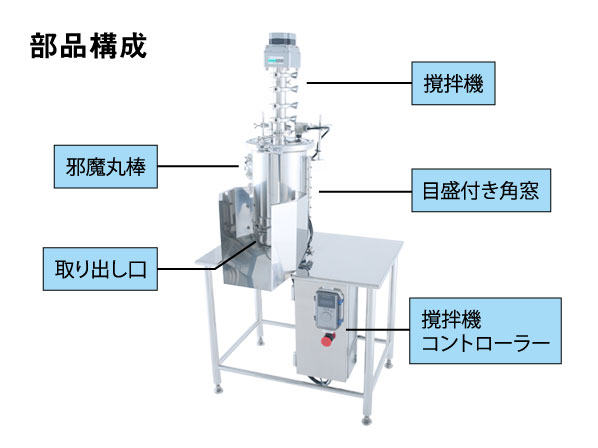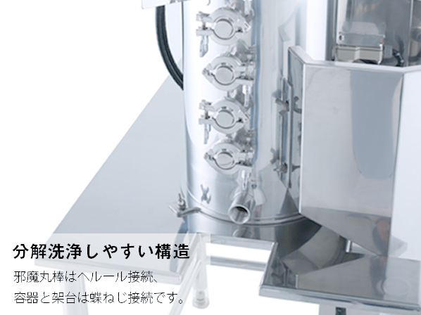 ・分解しやすく洗浄しやすいサニタリー仕様にするため、架台と容器・容器と邪魔丸棒などの固定をねじやヘルールにしました。