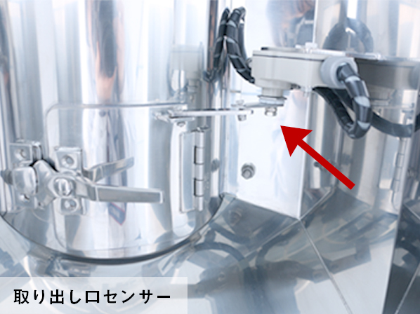 ・安全対策として蓋と取り出し口の開閉を感知するセンサーを設置しました。蓋や取り出し口が開くと撹拌機が自動で停止します。