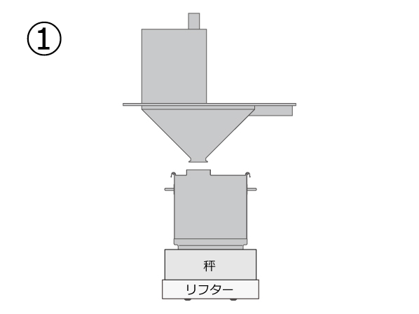 ・秤を載せたリフターに受け容器を置き、ホッパーの排出口まで上昇させます。