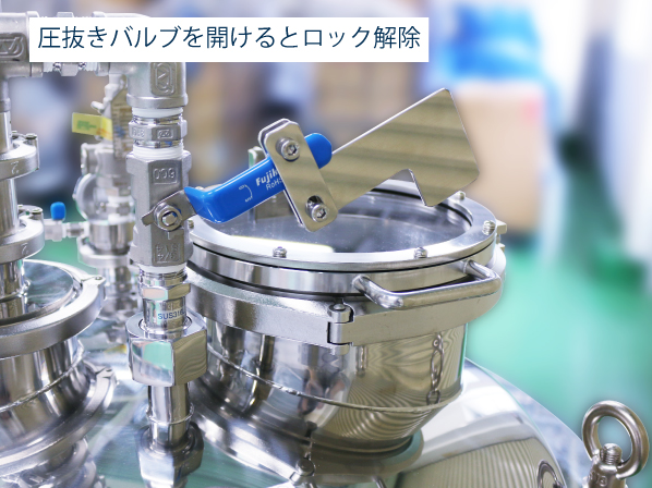 圧力をかけたまま窓(投入口兼のぞき窓)を開けると、勢いよく開いてしまい危険なため、窓の取っ手部分にロック機構を採用しました。圧抜き用のバルブと連動しており、圧力を抜かないと窓を大きく開けないようになっています。誤って窓のクランプバンドを先に外してしまっても、勢いよく開くことがなく安全です。 - 「火傷防止カバーの取り付け」
