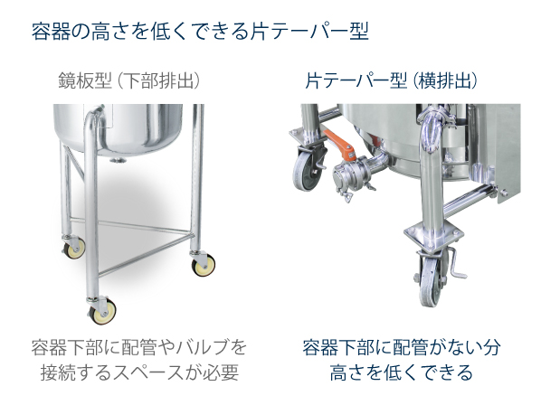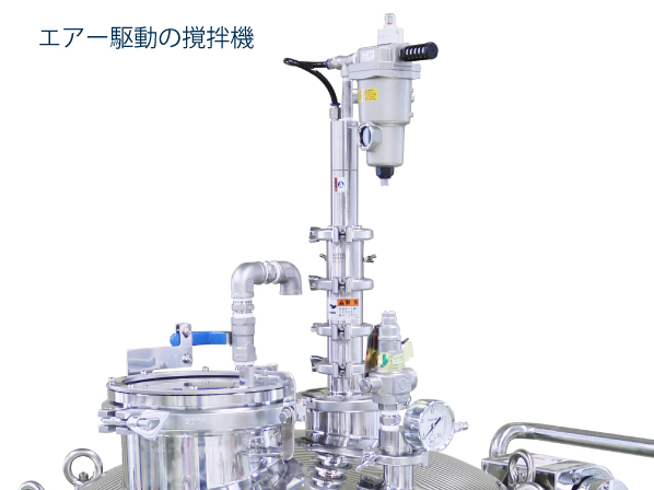 通常の加圧容器は底が鏡板型ですが、高さをできるだけ下げたいという意向と横向き排出、片勾配の希望があり、片テーパー型で製作しました。 - 「エアー駆動の撹拌機」