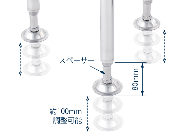 設計担当コメント アジャスターの調整範囲が100mm以上必要とのことで、通常よりねじの長さが長いアジャスターを選定しました。また、アジャスターのナットの位置を80mmにしたいとのことで、スペーサーを追加した設計にしました。