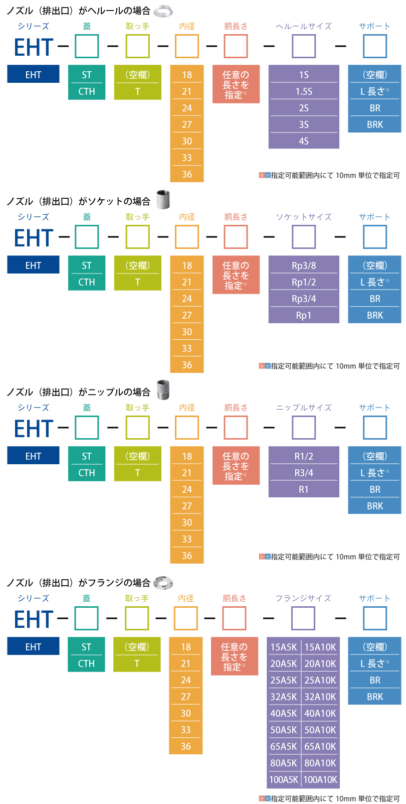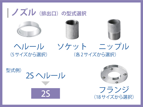 [ノズル(排出口)] ヘルール(5サイズ)・ニップル(2サイズ)・ソケット(2サイズ)・フランジ(18サイズ※)